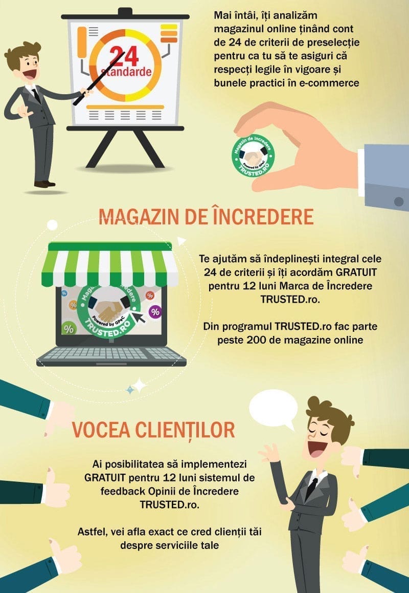 - Granting of the TRUSTED.ro trust mark & Trusted Reviews Feedback System (free for 12 months - service price is 240€/year)